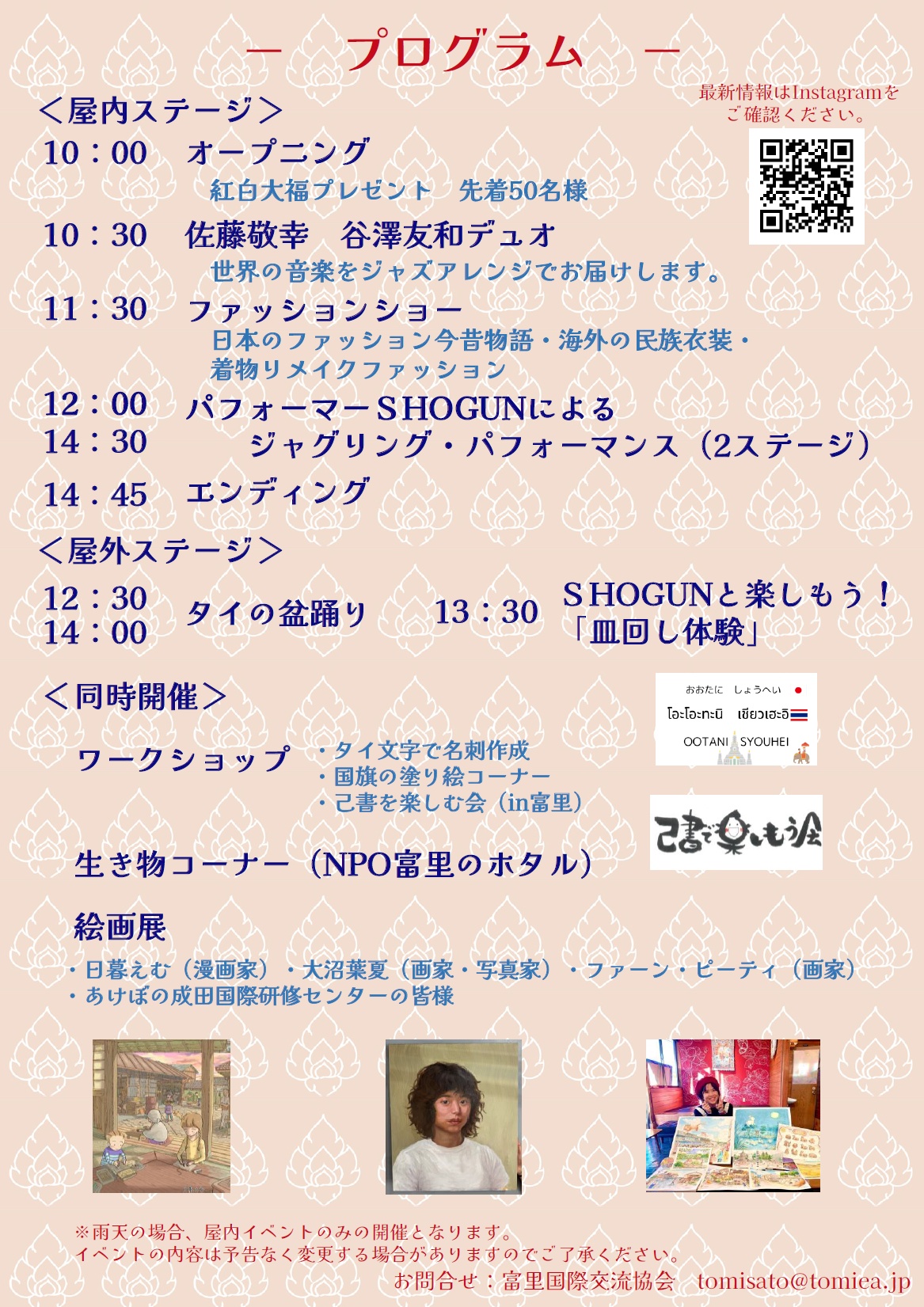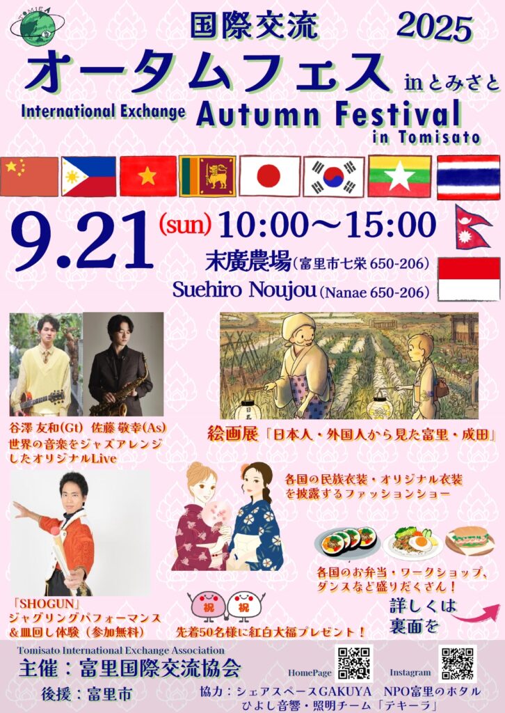 今年は日本と世界の接点に注目し、外国人の方も一緒になっての和装ファッションショーや、日本人、外国人から見たそれぞれの日本、富里成田地域をテーマとした絵画展などを行います。